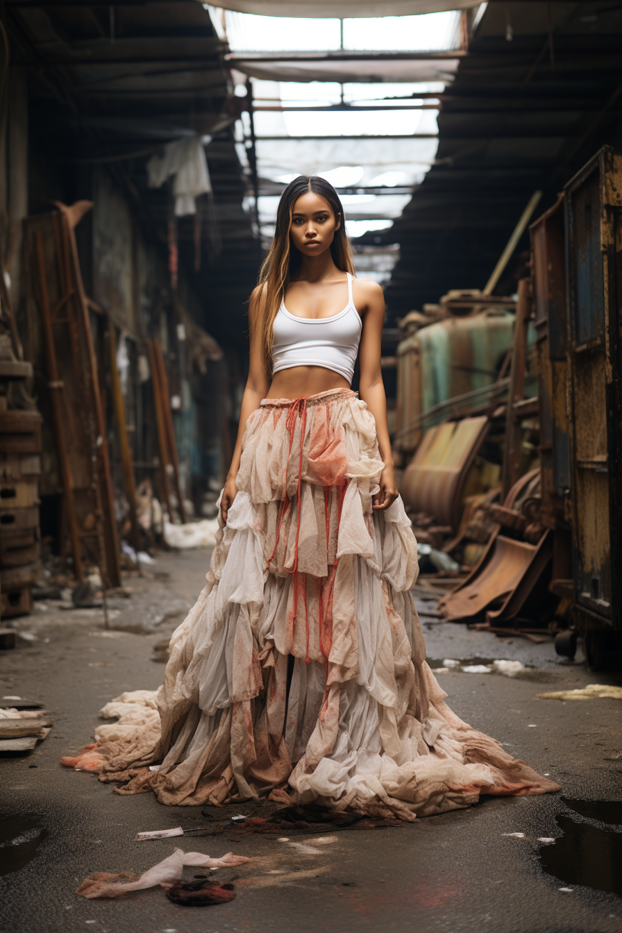 Ready-to-wear, ready-to-discard, this piece critiques disposable fashion culture. Each sale recovers 15kg of plastic debris
